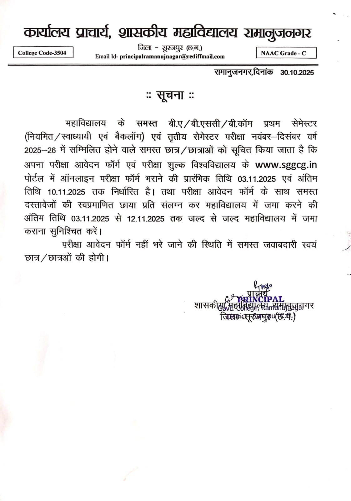 Government Collage Ramanujnagar is an institute of higher education, situated in the district of Surajpur. The collage was established in the year 2008 with the undergraduate program in the discipline of arts, science and commerce. It is affiliated to Sant Gahira Guru University, Sarguja, Ambikapur , chhatishgarh. Starting with merely handful of 81 students in the mangal bhawan of Ramanujnagar, the college, today owns its own building, spacious campus and has about 700 students who are persevering to give meaning to their life.