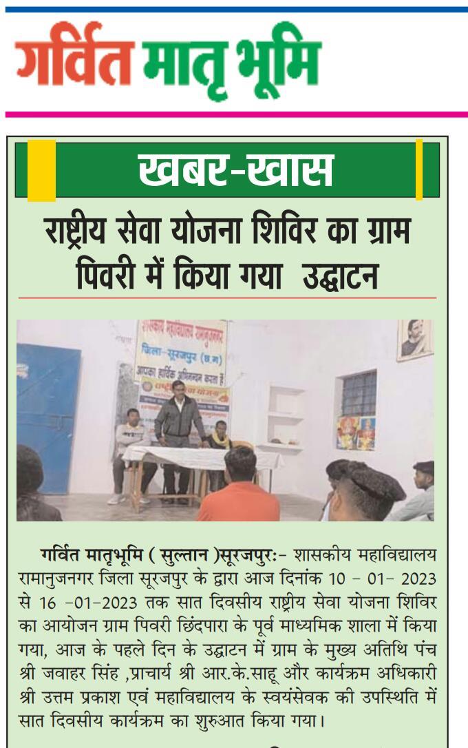 इस महाविद्याय में राष्ट्रीय सेवा योजना (NSS) का प्रारंभ वर्ष २०२१ में हुआ । यह भारत सरकार के खेल एवं युवा कल्याण मंत्रालय नई दिल्ली द्वारा संचालित है। राष्ट्रीय सेवा योजना एक स्वैच्छिक सामुदयिक सेवा कार्यक्रम है जो महाविद्याय के छात्रों को सामुदयिक सेवा शामिल होने और स्वैच्छिक कार्य करने का अवसर प्रदान करता है। जिसका उद्देश्य उनके नेतृत्वा और समग्र व्यक्तित्व का विकास करना है।